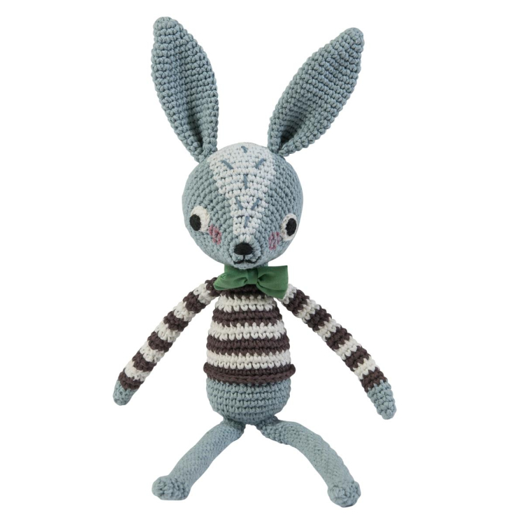 Nejlepší kamarád do dětské postýlky, k mazlení, ale i parťák při cestách za dobrodružstvím. Ručně háčkovaný králíček vašemu dítěti vykouzlí úsměv na tváři a vždy, když bude smutné jej rozveselí. Pořiďte mu hračku s duší a podlehněte neodolatelnému charisma tohoto elegána se zeleným motýlkem a pruhovaným svetrem.