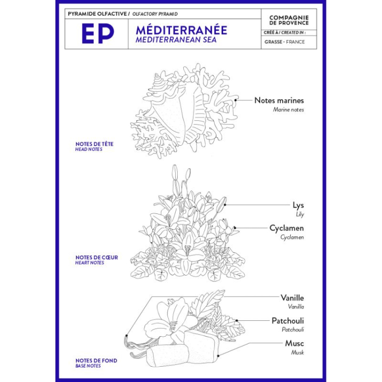 Krém je plastové tubě a má jemnou nemastnou texturu a dobře se vstřebává. Je bohatý na vyživující rostlinné oleje z Provence, bambucké máslo a med. Jemnou pokožku rukou zjemní a vyživí. V neposlední řadě si užijete nádhernou vůni svěžího středozemního moře, jehož vůně byla vytvořene přímo ve městě proslulém výrobou parfémů ve francouzském Grasse.