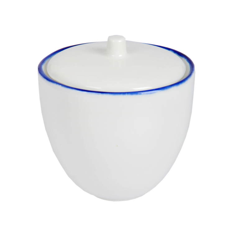 Bílá porcelánová cukřenka s jemnou ručně malovanou modrou linkou po obvodu je součástí kolekce ručně malovaného porcelánu „Elsa“, která se vyznačuje puristickým designem a mírně nepravidelnými tvary. Každý kus je tak originál a vy si můžete sestavit svůj vlastní jídelní servis.