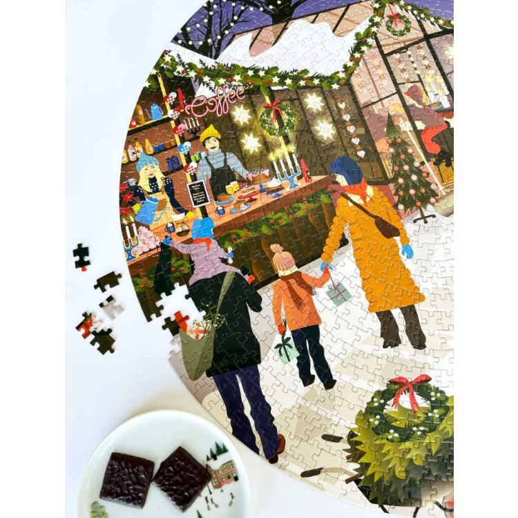 Vánoční trhy ožívají veselými hlasy, vůní horkého punče a kouzlem očekávání. Všude kolem zní koledy, světýlka se třpytí a ve vzduchu je cítit radost z blížících se svátků. Puzzle Christmas Market od dánské značky ViSSEVASSE zachycuje právě tuto kouzelnou atmosféru. Jemná ilustrace plná detailů vás přenese přímo do srdce zimního trhu.