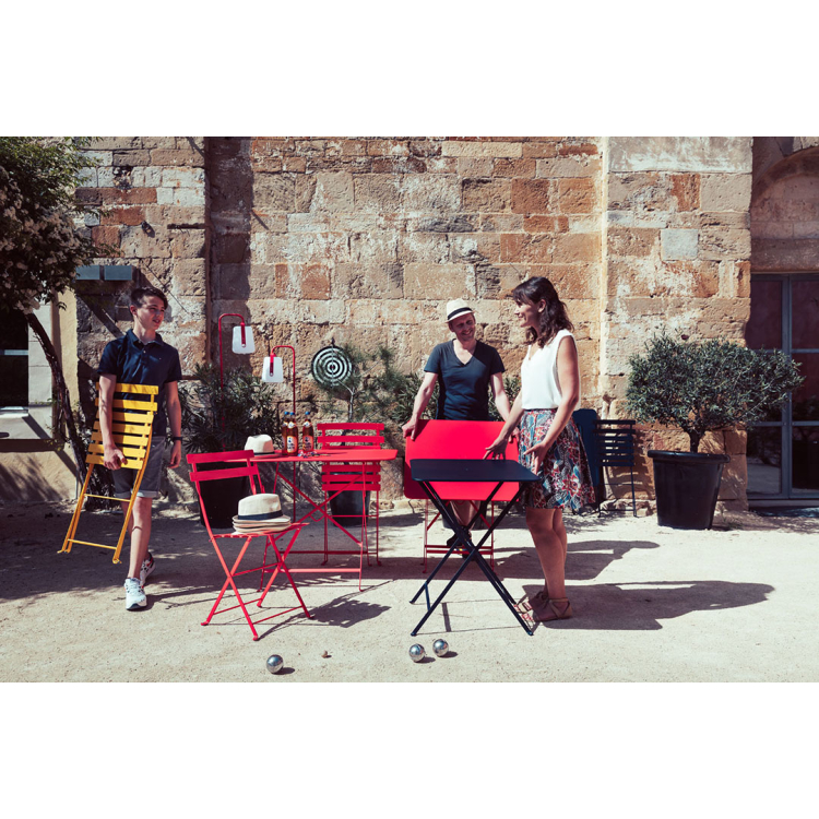 Skládací stůl Bistro se snadno skládá, zabírá velmi málo prostoru a vyhovuje tak současnému životnímu stylu. Je vyroben z lakované oceli a skvěle se doplňuje s kovovými židlemi z kolekce Bistro. V antracitové barvě bude ve vaší zahradě či na terase nápaditým a užitečným doplňkem, na který nedáte dopustit. Specifikace: - lakovaná kovová konstrukce - vysoká ochrana pro venkovní použití - prášková barva s anti-UV účinkem - plastové kluzáky - vhodné pro 3 - 4 osoby - vhodné pro veřejné využití (např. restaurační zařízení apod.) - v desce stolu 41 mm otvor pro slunečník Práškové barvy používané společností Fermob neobsahují žádná rozpouštědla a jsou 100% recyklovatelné s nulovým odpadem.
