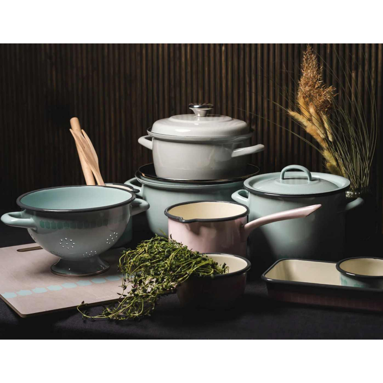 Smaltovaný cedník Vappu od finské značky Muurla vás okouzlí svým jednoduchým designem. Série smaltovaného nádobí Vappu byla inspirována secesními budovami v Helsinkách, a tak do vaší kuchyně vnese atmosféru severského, ale zároveň klidného a teplého domova. Je to šikovný pomocník při proplachování zeleniny, salátů či těstovin. Díky svému designu a barvě může být v kuchyni i ozdobou a posloužit třeba jako mísa na ovoce.