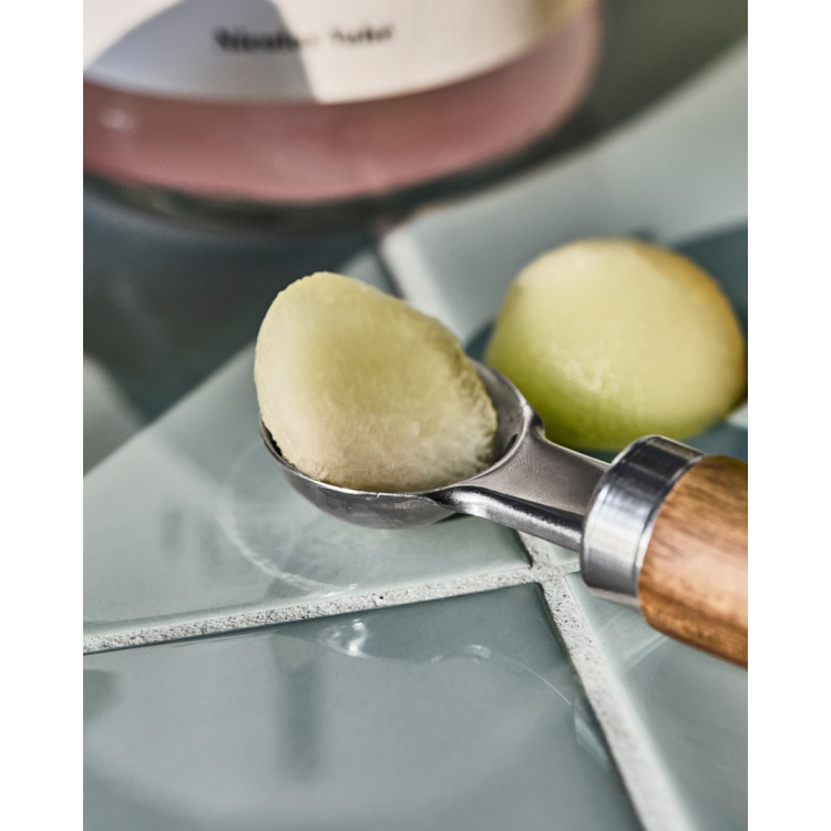Vykrajovač na meloun od značky Nicolas Vahé se stane nezbytným pomocníkem ve vaší kuchyni. Je vyroben z nerezové oceli s rukojetí z akáciového dřeva a je ideální pro výrobu melounových, ale i jiných ovocných kuliček. Kuličky můžete dát do ovocné mísy, limonády nebo s nimi naaranžovat dort nebo jiný dezert. Z obyčejného pokrmu tak snadno vytvoříte kulinářské dílo, které zaujme na první pohled.